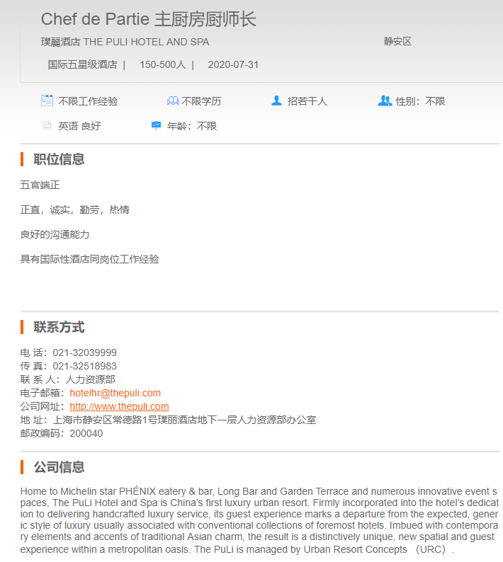 璞麗酒店主厨房厨师长