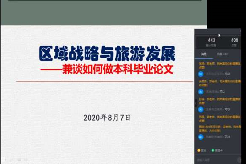 区域战略是指一定区域内的经济、社会发展中有关全局性、长远性、关键性的谋划。我国正在实施区域协调发展战略,我院为让学生了解区域战略内容和旅游发展趋势,于8月7日下午7时,诚挚地邀请了郭叶波老师在线上进行以“区域战略与旅游发展”为主题的讲座。我院全体学生积极参与本次讲座。