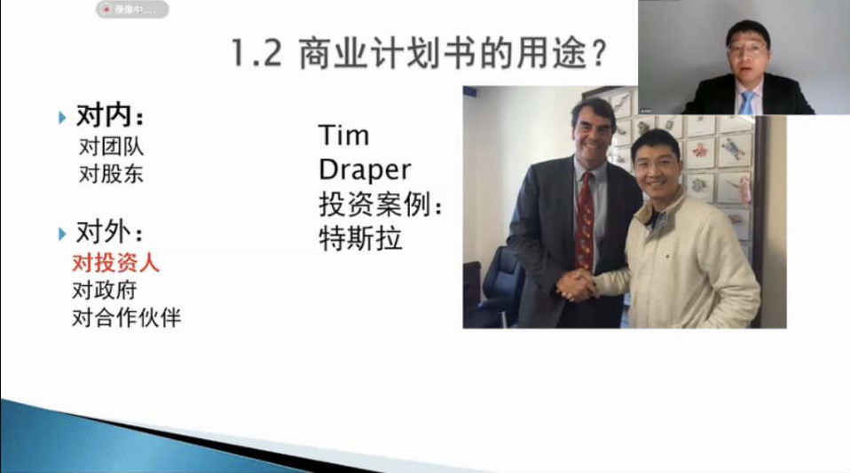 讲座伊始,詹博士为学生们讲解了商业计划书的用途,分为吸引人才的加入、吸引投资人进行投资和为获得政府的支持而制作。不同用途的商业计划书的详略度、要保密的内容以及格式都需要针对性的设计和调整。