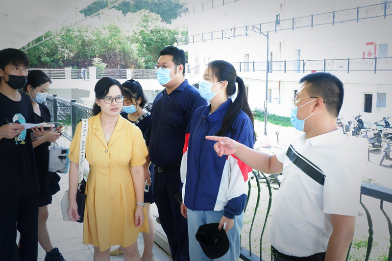 党总支副书记王翔与团委副书记吴小柳、李琴,曹添老师叮嘱学生记录宿舍情况