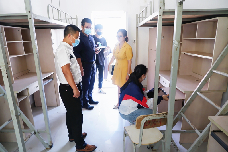 老师们走访了南一并仔细查看宿舍内的设施完好程度以及水电等方面的问题,并做好相关记录,遇到设施问题严重的宿舍拍照记录。王翔书记强调检查要全面、要小到细节,例如桌椅是否配套、门窗是否能牢固、灯管是否能亮,另外重要问题要单列出来,以便及时地上报给学院后勤部,尽快解决问题。