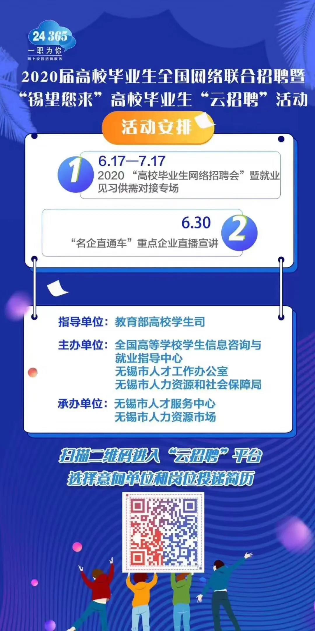 “锡望您来”高校毕业生云聘会从6月17日持续至7月17日,期间将持续发布优质岗位信息,举办高校毕业生就业岗位和实习岗位供需对接专场、企业直播宣讲等活动。各类用人单位和高校毕业生可通过以下网站进入云聘会。