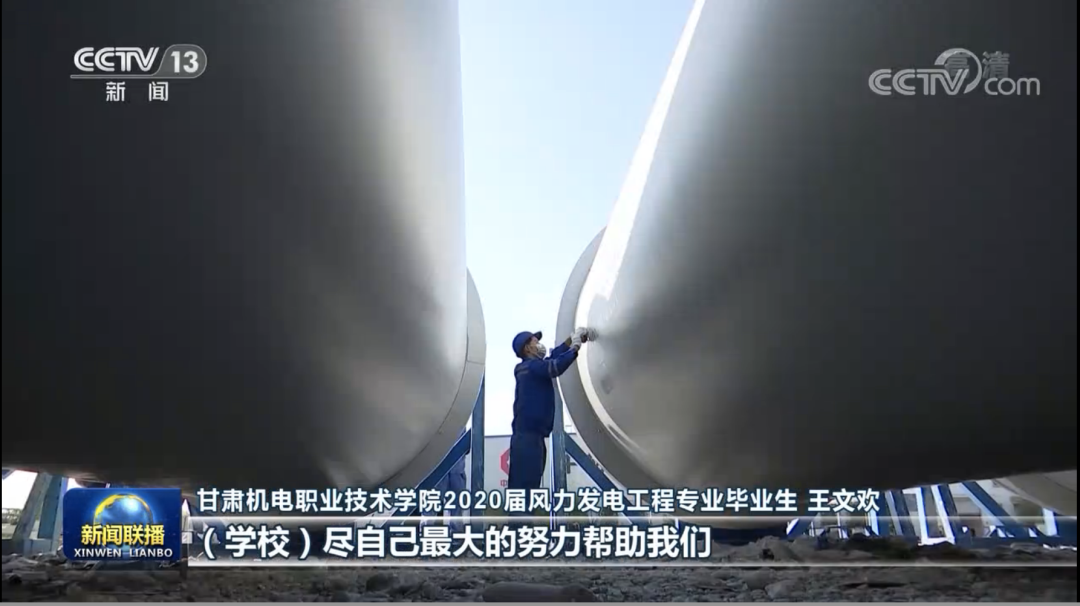 这个在风机叶片上忙碌作业的小伙叫王文欢,是甘肃机电职业技术学院2020届毕业生,来自52个未摘帽贫困县建档立卡贫困户家庭。疫情期间,正当他为找工作而焦虑时,辅导员主动联系他推送多个优质岗位,在“一生一策”精准帮扶下,最终他成功签约了酒泉这家公司。