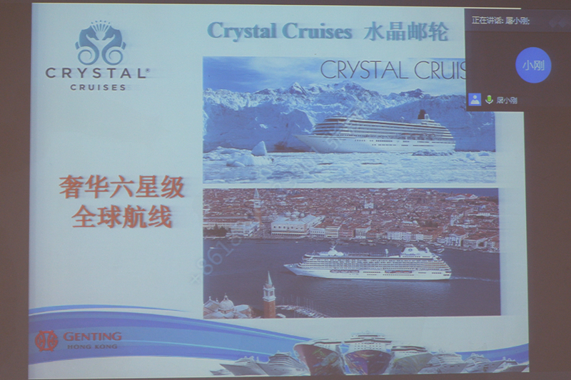 受疫情影响,云顶邮轮集团负责人屠小刚采用了线上远程会议的形式开展了本次招聘会。会议伊始,屠先生在简要地概括了本次招聘会的内容后,便介绍了邮轮行业的发展前景、邮轮人才的就业情况及云顶邮轮集团的基本信息。通过播放邮轮宣传片,他为学生们介绍了邮轮市场的发展前景,并结合数据和图片加以分析,让学生们了解到了中国邮轮行业发展的巨大潜力。