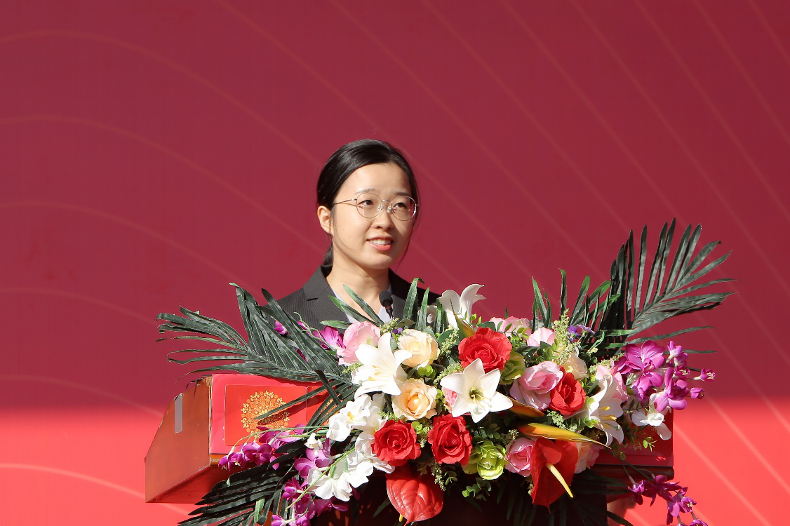 接着,青年教师代表吴邵颖老师上台进行发言,她向我们讲述了青年教师的教学活动与美丽校园的心灵碰撞,她表示师生们要谨记校风校训精神,与学校一同乘风破浪,再铸璀璨新辉煌。