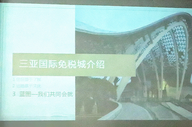 招聘会伊始,陈先生向学生们做了简单的自我介绍,随后就开始介绍中免集团三亚市内免税店有限公司的发展历程,三亚免税国际城是全球最大的单体市内免税店,国际大牌旗舰店云集,曾有门店的销售额创下国际奢侈品牌的全球记录,不仅带动三亚市海棠湾旅游区的发展,而且助力海南国际旅游岛的建设。