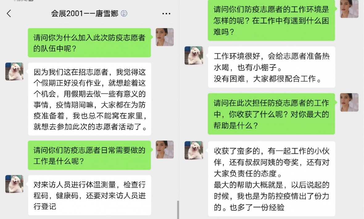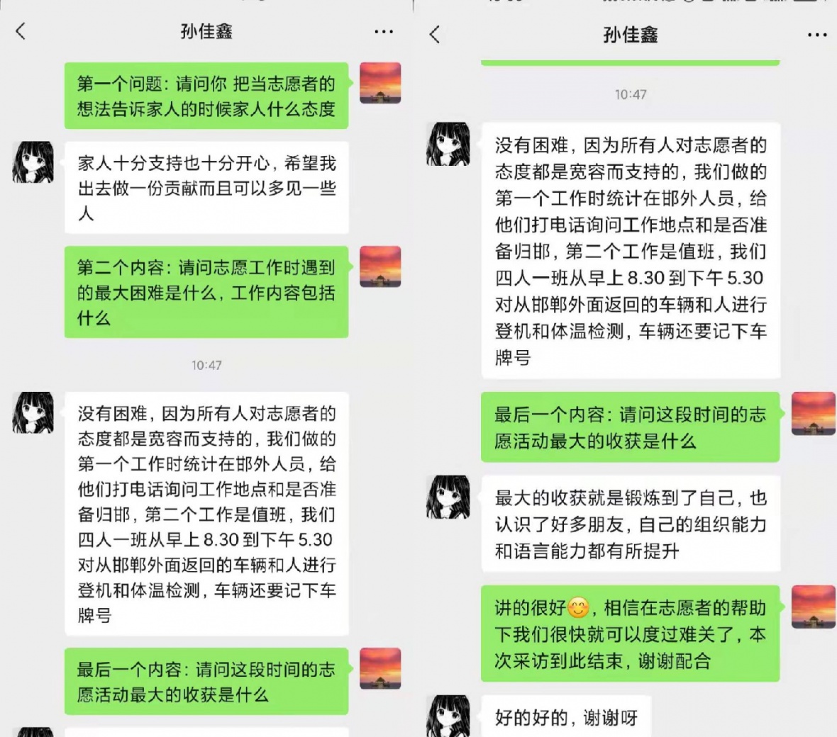 出生在物资丰盛的和平时期,成长于互联网飞速发展的信息年代,90后、00后一度被人们贴上关注自我、特立独行的标签。但是在疫情面前,他们用“自己的方式”勇敢地站了出来,不畏艰险地忙碌在抗疫战线。学生孙佳鑫提出想参加社区疫情志愿者活动时,她家人很欣慰并且积极支持她的想法。采访中,孙佳鑫高兴地提到她的工作顺利开展,所有人对志愿者的态度都是宽容且支持的。他们的第一份任务是统计邯外人员,打电话询问邯外人员的工作地点和是否有准备归邯的意愿;第二份任务是社区值班,“我们四人一班从早上八点半到下午五点半,志愿者们需要对从邯郸外面返回的车辆和人进行登记和体温检测,车辆还要记下车牌号,严格按规定执行工作。”孙佳鑫表示此次志愿活动最大的收获是锻炼了自己的意志,广识益友,而且自己的组织能力和语言能力都有所提升。