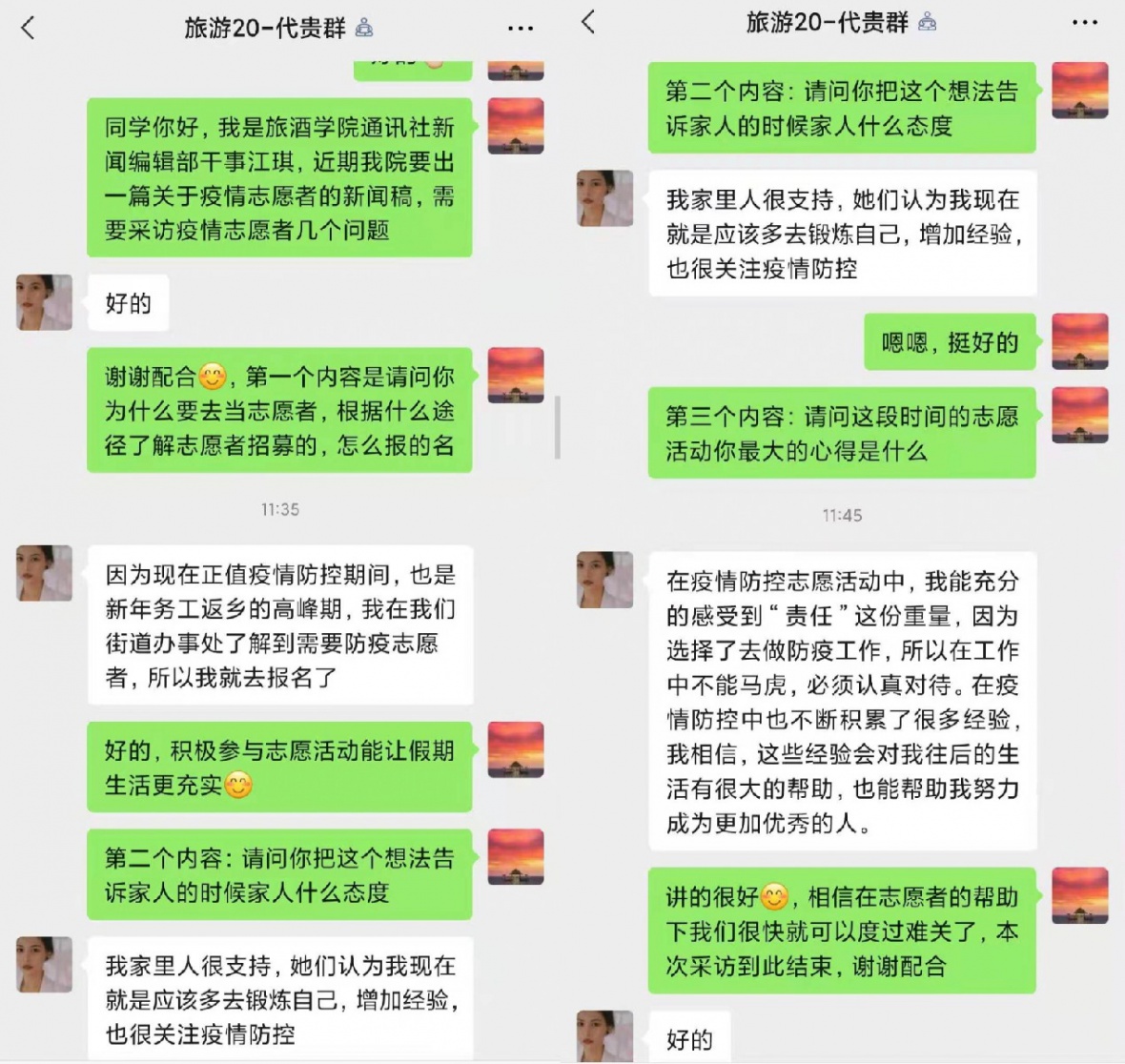 “想要充实自己的假期生活,为国家抗疫工作做出一点贡献。”这是旅游2002班学生陈佳怡报名参加志愿者活动的目的。学生陈佳怡在家通过手机软件“志愿汇”报名参加了志愿组织。她在采访中谈到了这段时间她参加志愿工作的具体内容:“我的工作是在小区门口配合保安检查居民们的口罩佩戴、健康码并测温。居民们都很配合我们的工作,每天都会有志愿者来,志愿者们会提前安排好自己的生活,把参加志愿活动的时间空出来,全心投入志愿工作。有人是天天都来的,这种决心和毅力就很值得我继续学习。”在采访最后,她谈到了“参加志愿活动能真切的感觉到自己可以帮助他人,感觉到自己的价值,防疫志愿工作,让我没有虚度时光。”