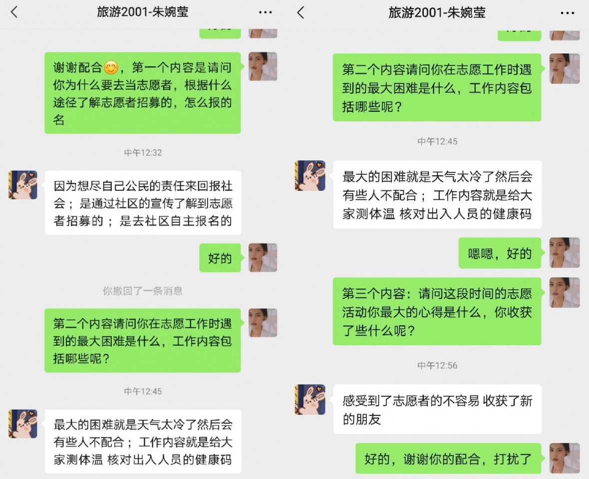 事实证明,危难时刻、紧要关头,青春力量没有退缩,而是主动请缨、积极应战。旅游2001班学生朱婉莹想尽自己公民的责任来回报社会,寒假期间她通过社区的宣传资料报名参加了社区的防疫志愿活动。朱婉莹的主要工作是给社区居民测体温,核对出入人员的健康码。通过本次志愿工作,朱婉莹切身感受到了志愿者工作的不易,但正因为有这些可爱的人在默默坚守,人民才能多一份心安。