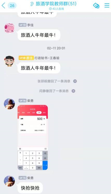 本次活动主要以线上群聊的方式举行。随着亮眼的红包发出,群里的氛围达到了高潮。老师们的新春祝福也紧随其后:新年快乐,牛年大吉,旅酒人牛年最牛等等。不仅如此,群中还开展了随机抽奖活动,多位教师幸运获得了惊喜大礼包。