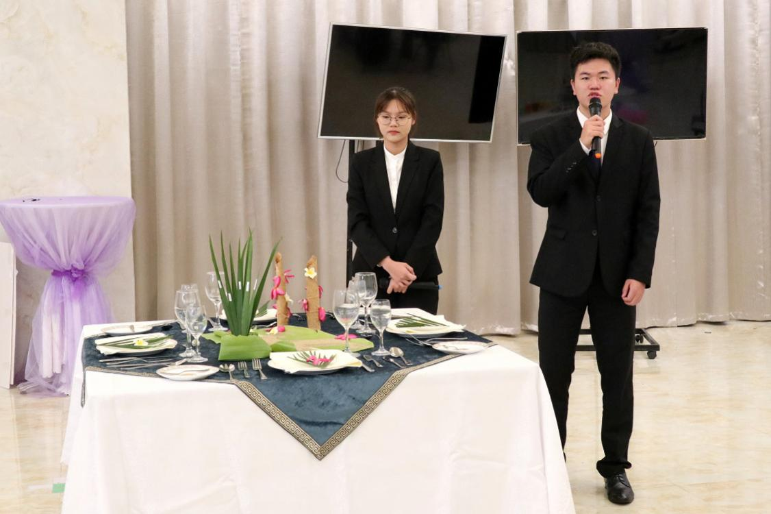 在主持人简单地介绍完教师后宣布比赛正式开始,本次比赛的主要内容是参赛学生以小组为单位合作设计一场宴会。于学生而言,这不仅是一场宴会设计比赛,更是一次前辈与后辈经验交流的机会。在本次宴会设计比赛中,各小组将除夕、中秋、元旦、圣诞等节日作为宴会主题,展示整体宴会设计的原因,宴会开展流程以及宴会台面、菜单的设计。18级学生姜平小组的宴会设计汇报中,更是细化到整个宴会的服务流程。学生们根据不同的宴会主题,设计出不同的宴会场地,在以元旦、除夕、中秋为主题的设计作品中,学生们也把中国传统文化融入到其中。19级学生的作品亦是精彩纷呈,学生们将元旦与毕业师生之情融合,在元旦之际回忆曾经的校园生活,在整个宴会布景中将中国文化与校园文化共同展现,这场以情动人的毕业生宴会更是令人期待。