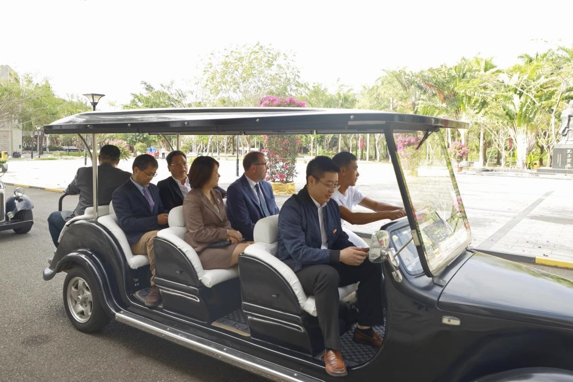合作双方乘车参观校园