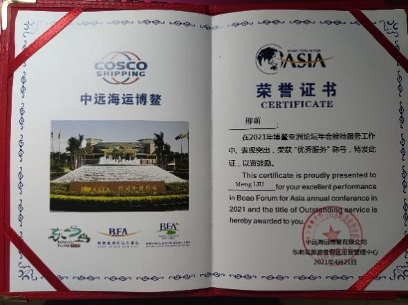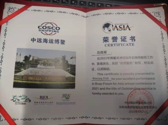 (2)2020年我支部成员参加博鳌亚洲论坛活动担任志愿者服务并获得“优秀志愿者”称号。