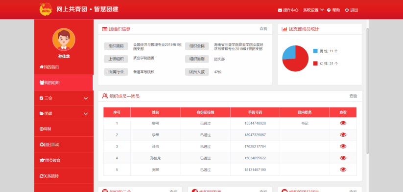 “智慧团建”工作情况,学社衔接率100%。团员管理工作达到较好水平,我班支部发展团员要求严格,团组织管理团员定期录入“智慧团建”系统,团内信息变更记录及时,目前我支部团员已经全部由原高中团支部转出并接收录入本支部智慧团建系统。开展活动时注意记录及材料存档,宣传委员每次在进行活动均拍摄活动现场照片,活动会形成新闻稿件上传本学院的官微以达到宣传的目的,主题团日活动均录入智慧团建系统。