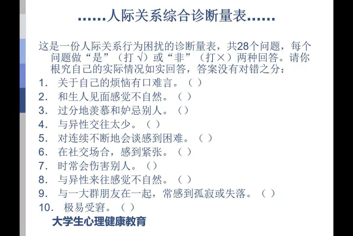 社会生活中的每一个人都生活在一个复杂的人际关系网中,每个人的成长和发展都依存于人际交往。对于正在学习、 成长中的大学生来说,人际交往是生活的基本内容之一,希望学生们在接下来的日子里,能够努力提高自己的人际交往能力。
