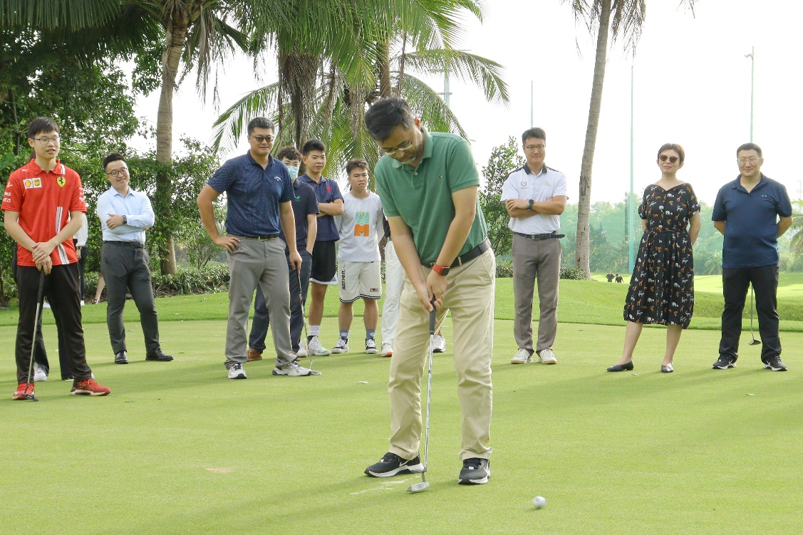 本次开幕式的亮点更是我院特色的高尔夫开球仪式。本次开球仪式由我院高尔夫班级的学生代表参与,学生代表们有条不絮,一气呵成,用力挥杆,将球击飞,飞出的球在天空划出了一道优美的弧线。此刻,这球不仅代表着我院旅游嘉年华活动正式开始,更代表老师们对我院学生的热切期望。高尔夫专业的学生们在展现球技的同时还与老师们开展了比赛,不仅增加了学生与老师的互动,还缩短了我院学生与老师之间的距离。美好的时光总是短暂,本次旅游嘉年华开幕式结束后,我院师生们共同合影留念。