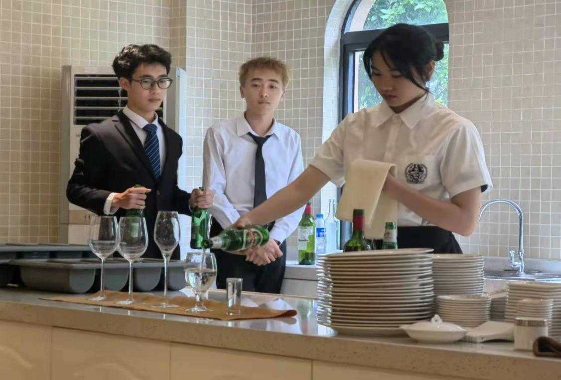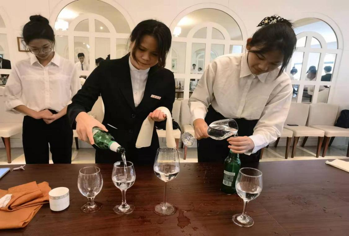 怀着对酒水文化的向往与热爱,我班学生认真聆听,不落下老师讲的每一个细节。在实操过程中,我班学生们左手搭着餐巾,右手拿起酒瓶,有条不紊地练习着,全神贯注是我班学生面对挑战的态度,锲而不舍是我班学生面对挫折坚持的决心,倒计时的滴滴答答声扣着我班每个学生的心弦,在一分钟内按比例酌好六种不同的酒,是我班学生最终的学习目标。随着老师一声令下,课后考试开始,沉着冷静地操作,展现了上课认真练习后的硕果,倒酒水流平和流畅,酒瓶起落安静无声。通过一节课的努力学习,我班学生圆满的完成了学习任务。在未来的学习过程中,我班学生也会再接再厉,不断进取不断进步,将酌酒文化牢记于心,将餐饮文明传播四处。