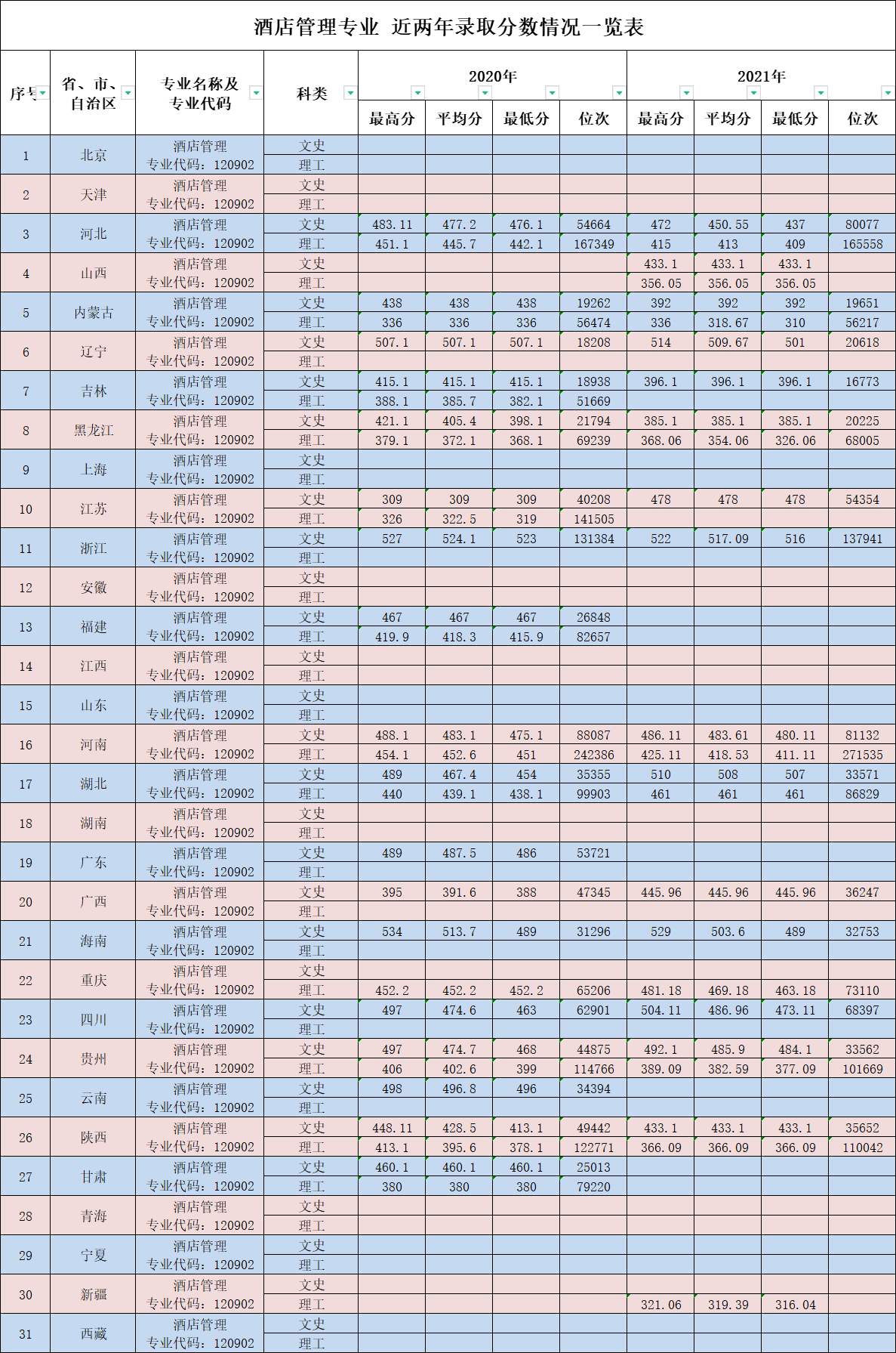酒店管理专业各省(市、区)2020&2021年录取分数线