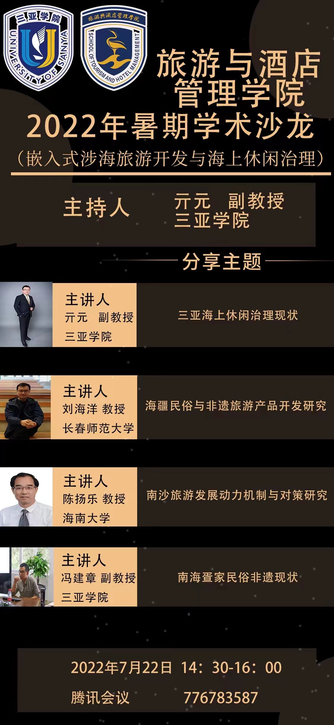2022年7月22日,由三亚学院旅业管理学院和国际酒店管理学院共同主办,以“嵌入式涉海旅游开发与海上休闲治理”为主题的教师学术沙龙活动顺利举办。