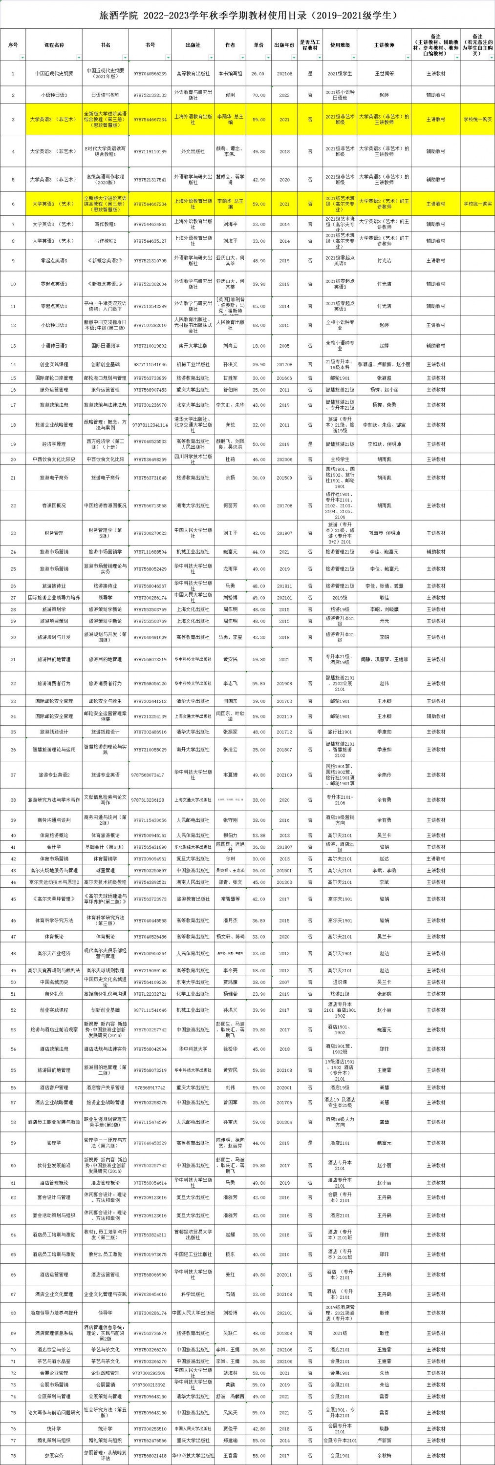现公布2022-2023学年秋季学期教材(含共同基础课和专业课)使用目录情况给全体2019-2021级学生,以供查阅。希望大家可以自制购买相应教材(由学校统一购买的已在教材目录中标注)提前预习新学期课程知识,做到学有可查、学有可鉴。