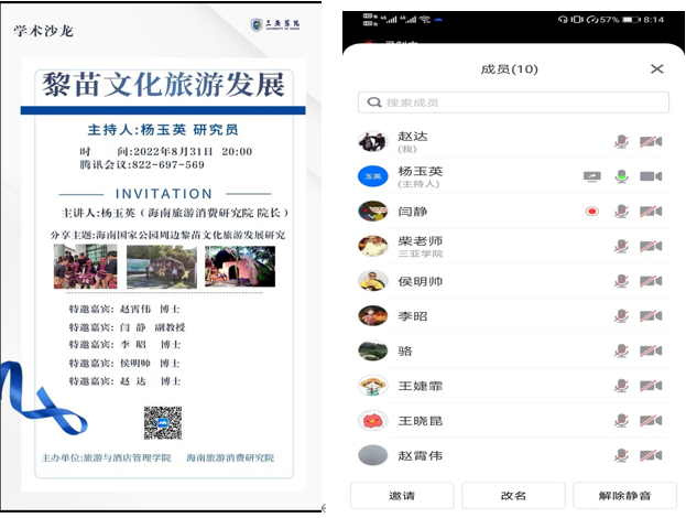 为积极推动团队暑期的科研工作,8月31日下午,我院旅游高质量发展团队在线上召开了《海南国家公园周边黎苗文化旅游发展研究》课题沙龙研讨会。本次研讨会由团队负责人海南旅游消费研究院院长杨玉英研究员主持,并邀请了海南省发改委赵霄伟副研究员、旅游与酒店管理学院院长柴勇副教授参与研讨。