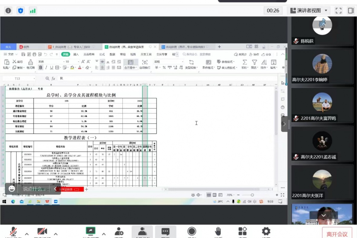 最后,吴兰卡老师为学生们讲解了总学时、总学分以及课程模块与比例,还详细介绍了教学进程表。通过吴兰卡老师的讲解让高尔夫专业的新生们更好地理解未来四年需要学习的课程和知识,也能在大学生活的开始为自己做好规划,提高自身的综合实力和实践能力。希望2022级高尔夫专业的新生们在未来的学习中充满动力,在未来的发展中前程似锦。