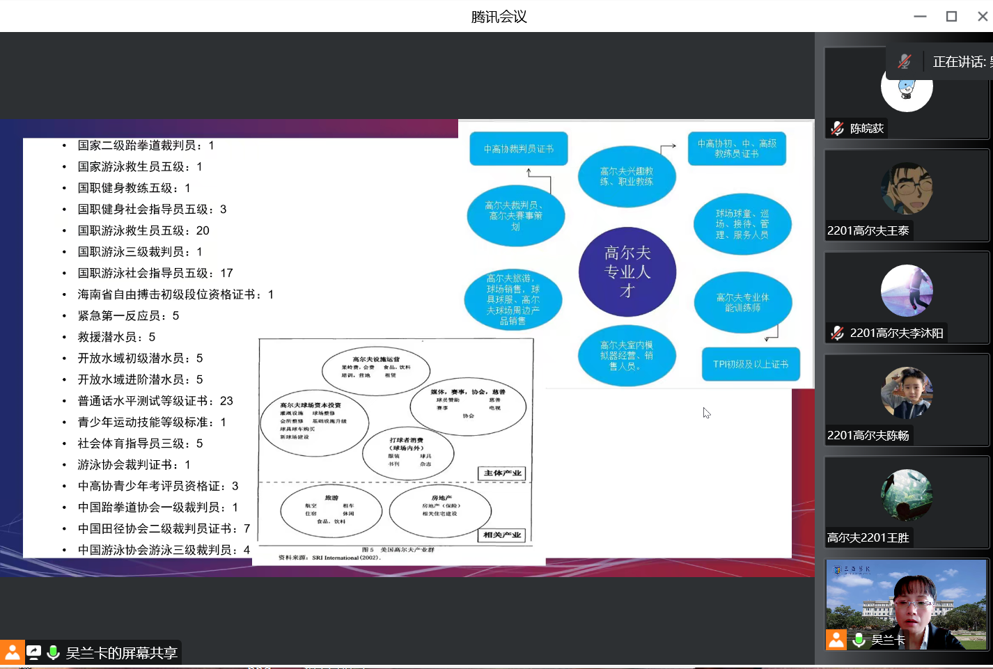花自向阳开,人要向前看。寒窗苦读十年后,2022级的新生们终于如愿以偿来到大学。在进入大学后的目标需要重新去思考,无论是短期的目标还是长期的目标,都需要根据所学专业去制定和规划,为了让2022级新生快速了解到高尔夫专业的整体情况,我院高尔夫专业负责人吴兰卡于9月21日上午8时在腾讯会议为新生进行专业入门指导,2022级高尔夫专业新生积极参加。