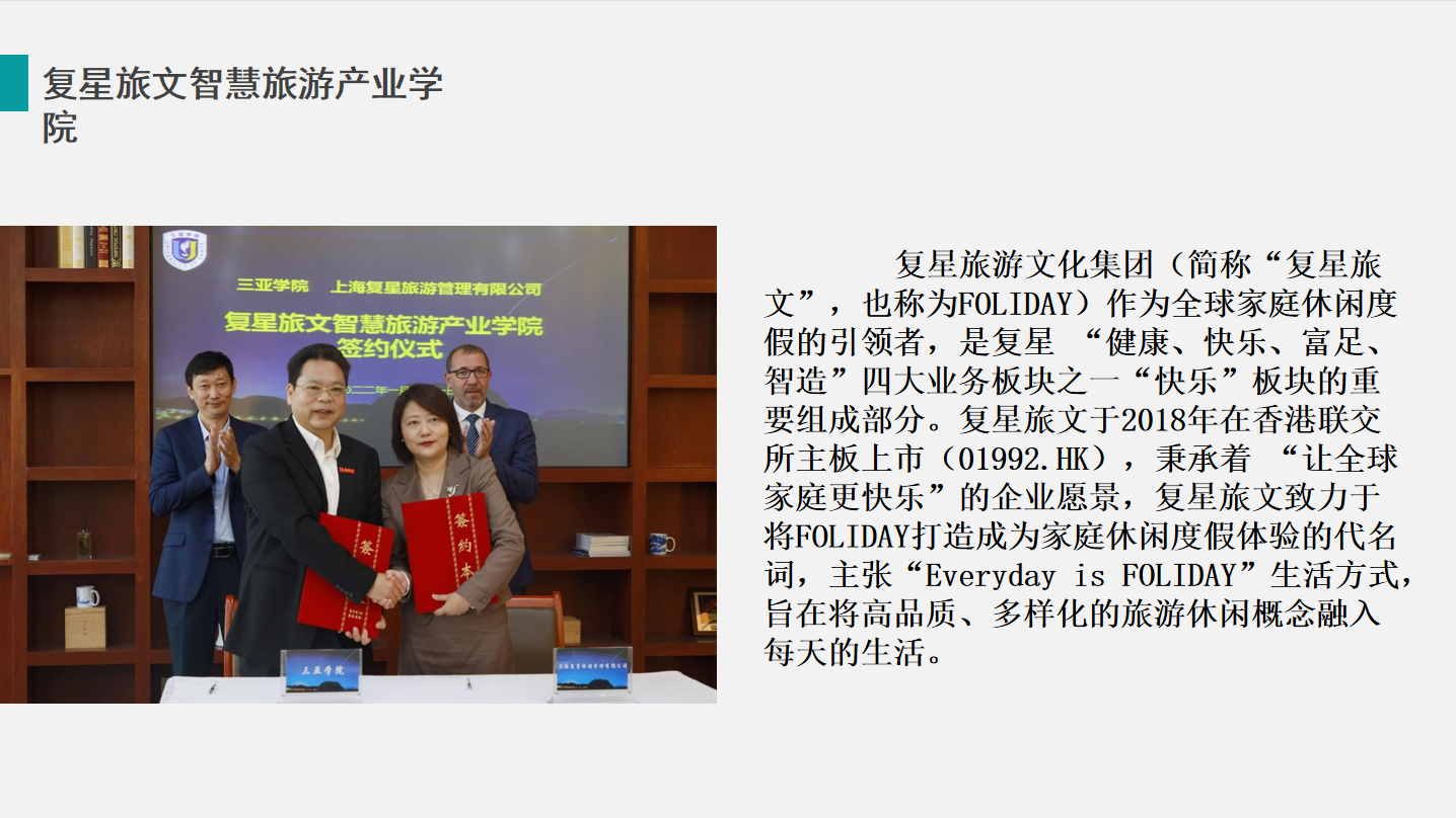 产教融合是我院旅游教育充分以产业需求为导向的人才教育的大胆创新。2022年1月21日我院与复星旅游文化集团上海复星旅游管理有限公司于复星旅文智慧旅游产业学院签约仪式。 复星旅文智慧旅游产业学院的成立是旅酒学院积极响应国家和学校的号召,深入贯彻落实党中央、团务院关于稳就业保就业决策的相关部署的结果。产业学院建立后,旅酒学院将充分利用自身专业优势与复星旅文集团积极进行信息交流,互通互利,紧密对接文化旅游行业的产业链和岗位群,积极探索全新合作模式,建立契合企业需求的人才培养模式。