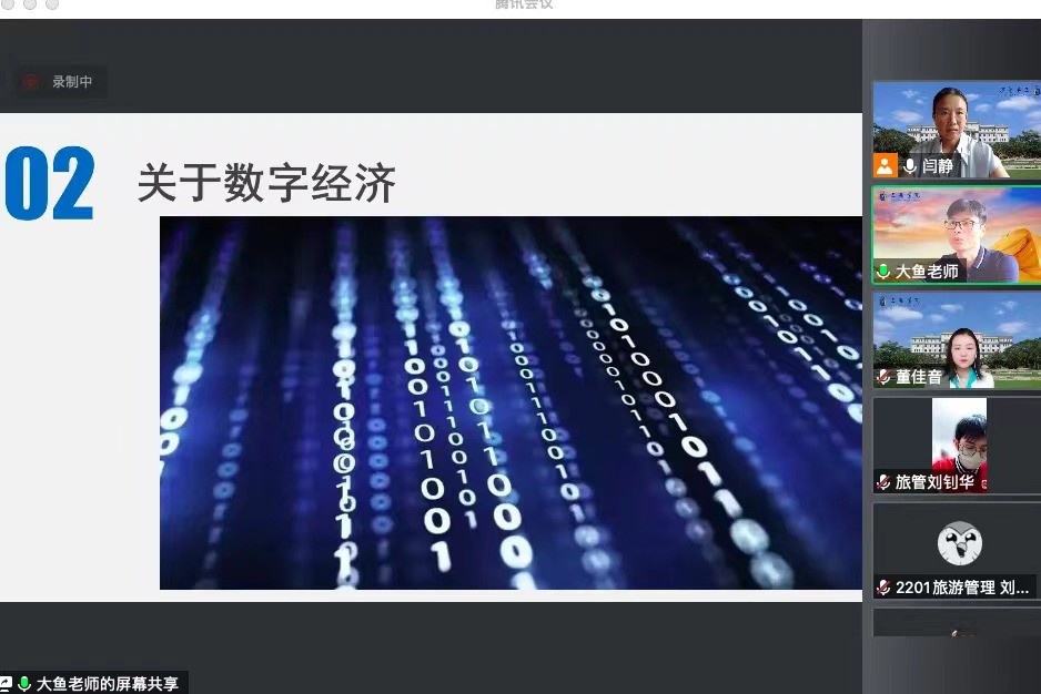 数字经济到底对我们有什么影响?余有勇老师通过生活中的数字化发展案例带领同学们深入了解数字经济下的旅游产业变革机遇。充分认知“数字经济是继农业经济、工业经济之后的主要经济形态,是以数据资源为关键要素,以现代信息网络为主要载体,以信息通信技术融合应用、全要素数字化转型为重要推动力,促进公平与效率更加统一的新经济形态。”的概念内涵与外延。