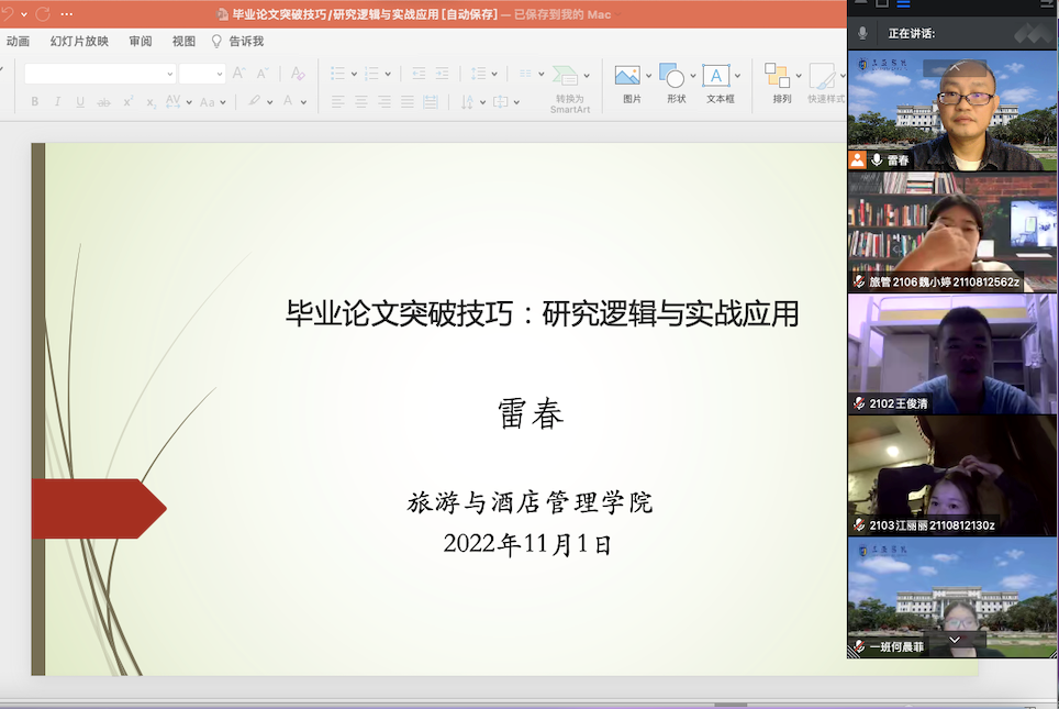 毕业论文是大学本科生最要的一项作业,是提升学生学术素养,培养思考问题、解决问题的重要途径,我院教学管理十分重视学生的论文质量。为针对目前本科生毕业论文写作困惑进行一个全方位的指导,帮助毕业生树立基本的学术思维,高效的完成毕业论文,11月1日,我院副教授雷春博士在腾讯会议给学生们做了一场题为“毕业论文突破技巧:研究逻辑与实战应用”的讲座,旅游管理专业大四(含专升本)学生近75人参加了本次讲座。