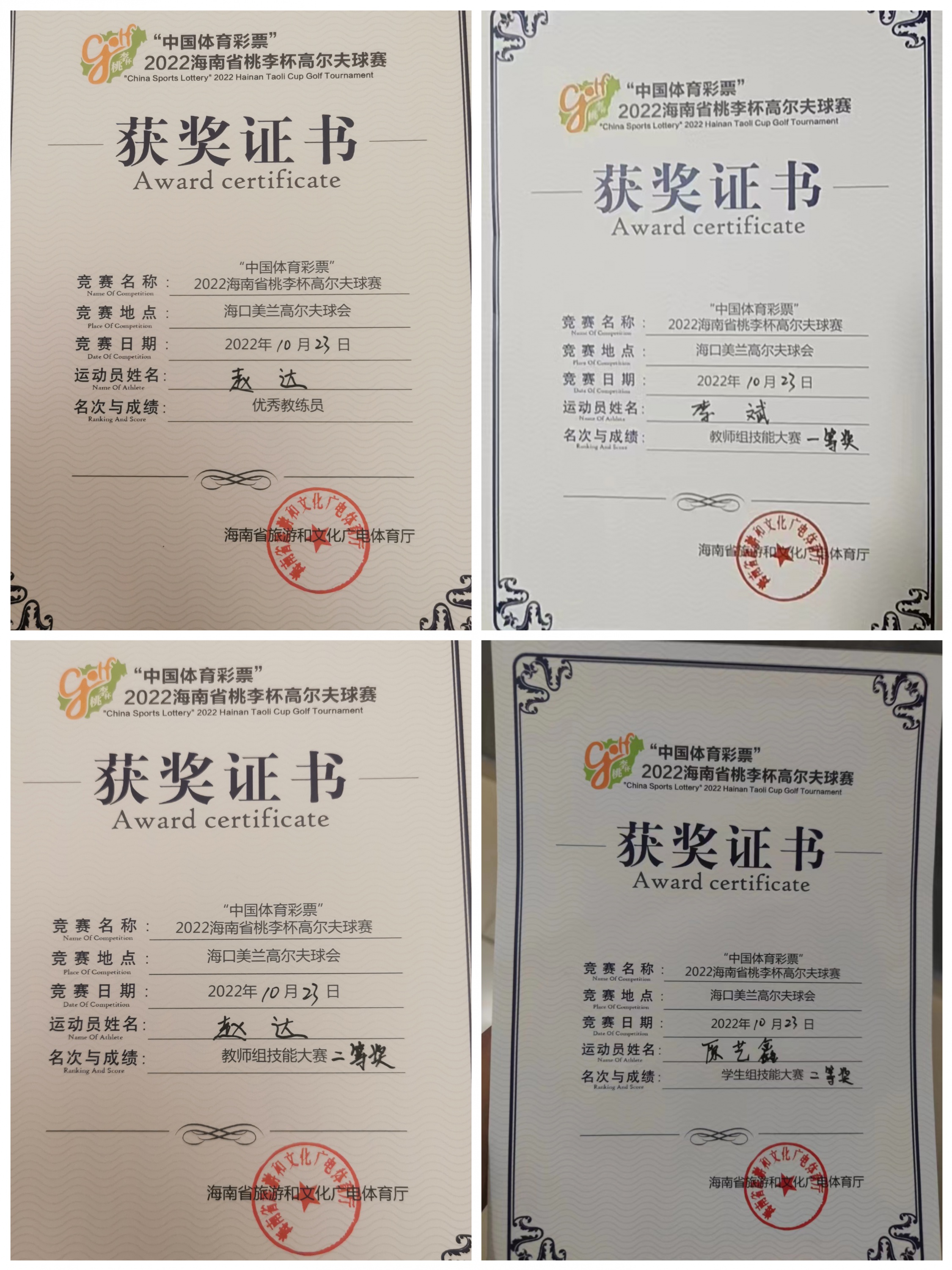 我院高尔夫球队在比赛中获得了十分优异的成绩。2020级学生原艺鑫获得学生组技能大赛2等奖;我院高尔夫专业李斌、赵达老师分别获得教师组技能大赛一等奖、二等奖;同时赵达老师也获得了2022年桃李杯优秀教练员称号。
