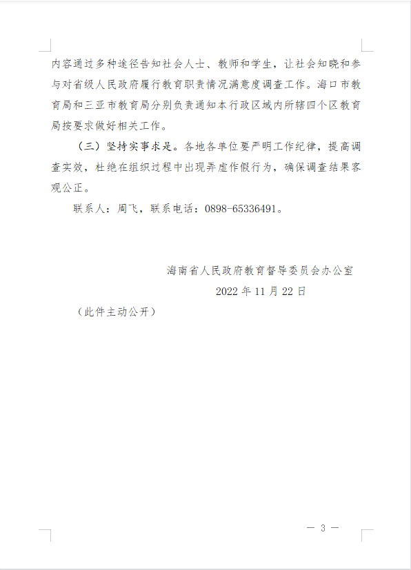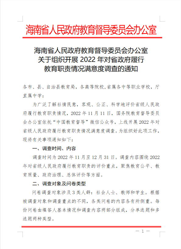 海南省人民政府教育督导委员会办公室 关于组织开展2022年对省政府履行 教育职责情况满意度调查的通知