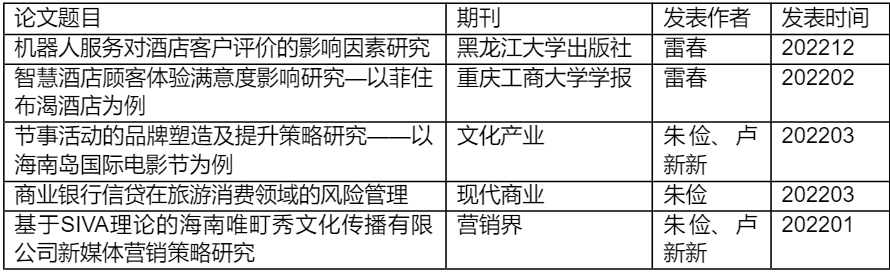 科研促进教学,科研带动创新,会展数字创新教研室团队始终不忘科研创新,通过一年的建设(2022年1月-12月),团队成员完成发表论文著作5篇,具体如下:
