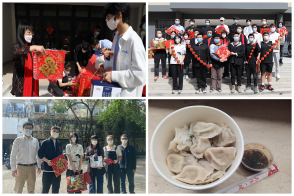 1月21日除夕,三亚学院副校长高一兰,学生处及相关学院党总支书记、团委书记和在校的思想导师们一同为留校学生们送来新春祝福。高一兰一行先后到各学生宿舍进行慰问,询问了留校学生们的学习和生活情况,转达了学校全体教师和同学们对他们的关心和牵挂。所有留校学生均收到了学校精心准备的新年大礼包,春节对联、防疫物资、牛奶、学习物品、热腾腾的饺子,让同学们感受到了浓浓的年味,心里也暖暖的。