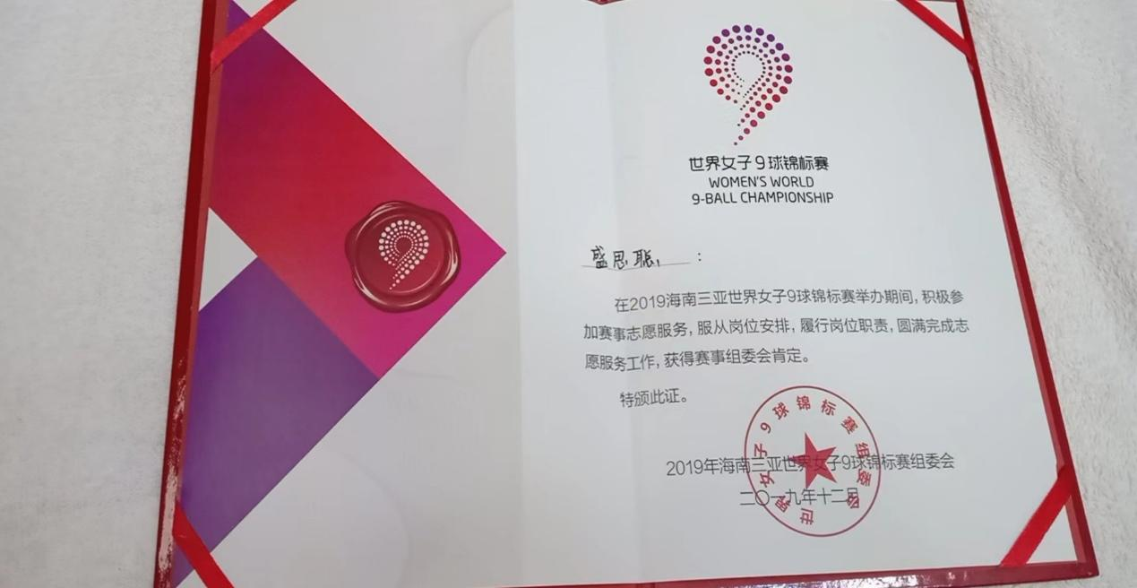 在紧张的学习中,盛思聪同学认为应该做些对自己有意义的事情,让自身得到全面发展。他分享自己参加了2019海南三亚世界女子9球锦标赛,积极参加赛事志愿服务,服从岗位安排,获得表彰。在20年时成为新生军训教官,因工作积极、态度认真,表现优异,被评为“优秀教官”。
