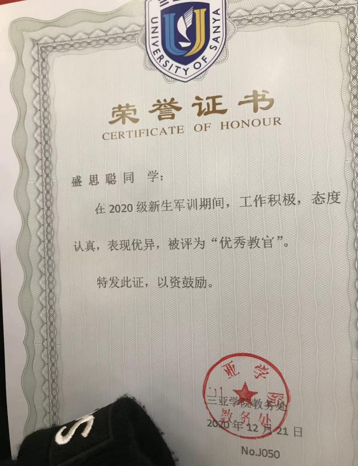 盛思聪同学被评为优秀教官获得的荣誉证书