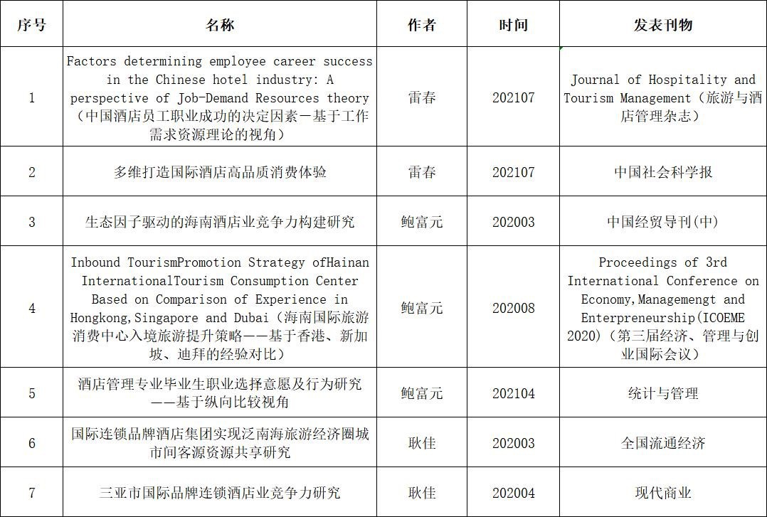 国际酒店与邮轮运营管理方向承担省部级以上项目30余项,为三亚酒店业发展提供政策建议20余项,其中我院新业态研究中心下设邮轮游艇研究中心和度假酒店与住宿业研究中心立足海南邮轮游艇产业发展,每年发布行业数据公报和行业发展建议10余篇。该方向聚焦基于游客体验的国际酒店消费提升研究、基于工作需求资源理论的酒店员工绩效提升、生态因子驱动的海南酒店业竞争力构建研究、三亚市国际品牌连锁酒店业竞争力研究、泛南海旅游经济圈城市间国际酒店客源资源共享研究等。