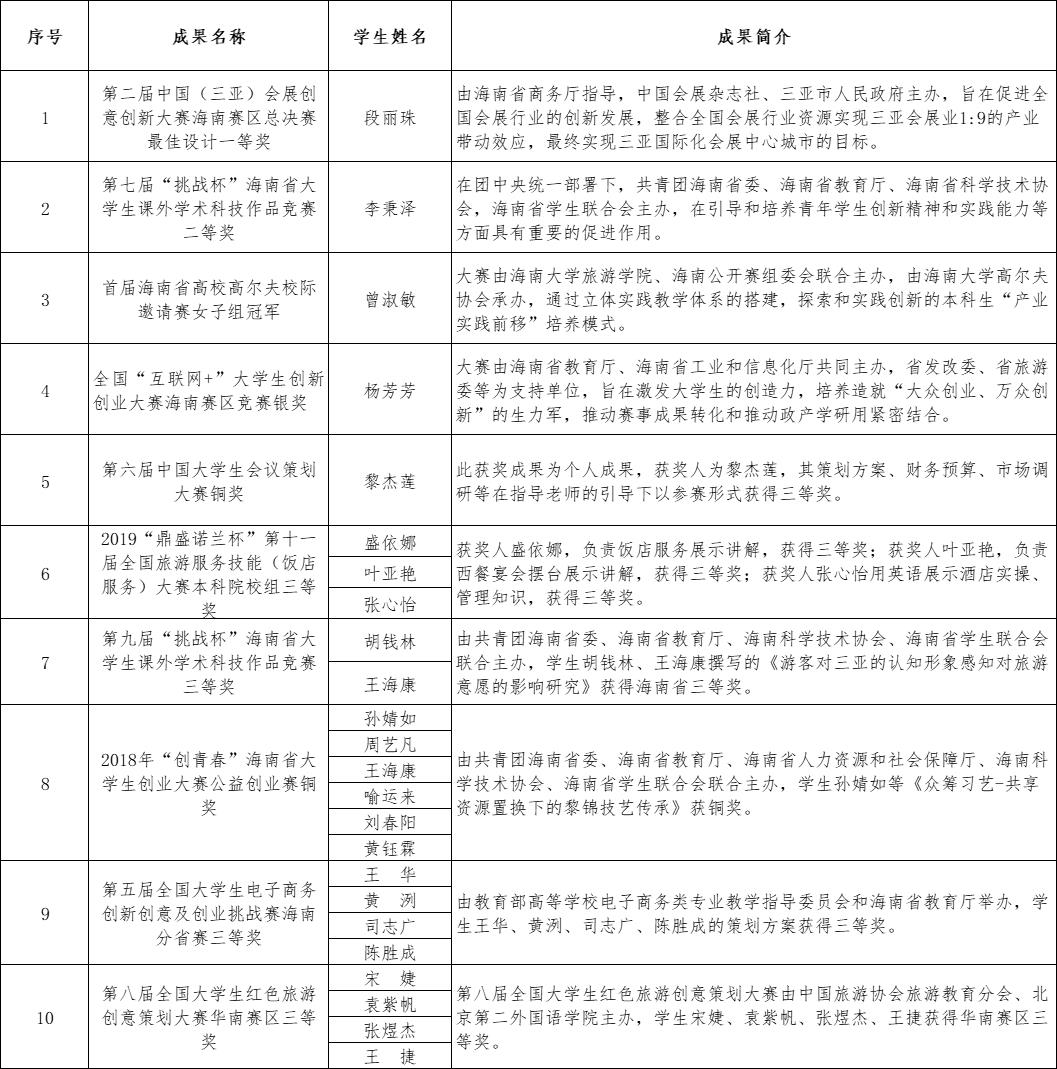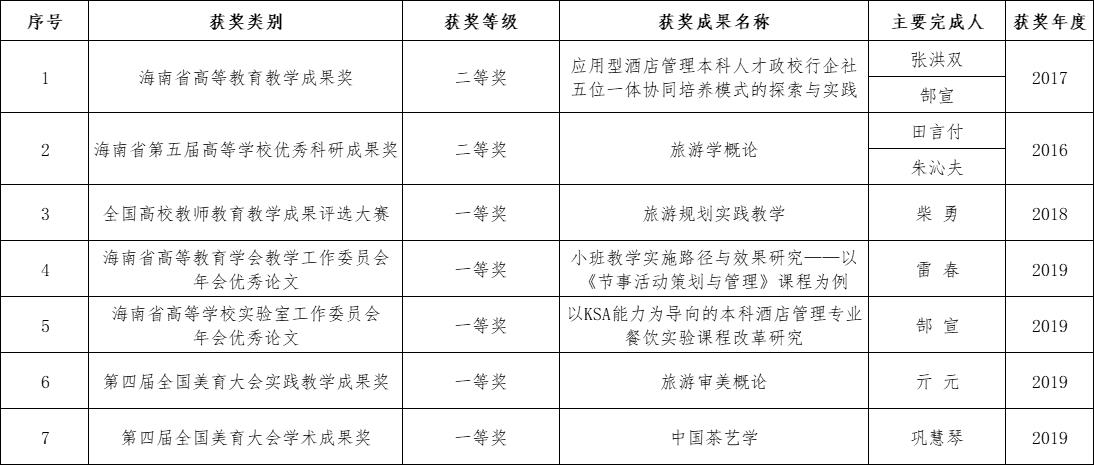 目前该硕士点下设酒店酒店管理和会展管理专业于2016年成为海南省应用型转型试点专业,牵头成立了海南酒店及会展人才培养创新联盟,旅游管理专业于2018年被评为省级一流专业。开设有《旅游学概论》、《客房服务与管理》等省级精品课程,《旅游人力资源管理》、《高星级酒店美食与成本控制》等省级精品在线开放课程。获得海南省优秀教学成果二等奖1次。