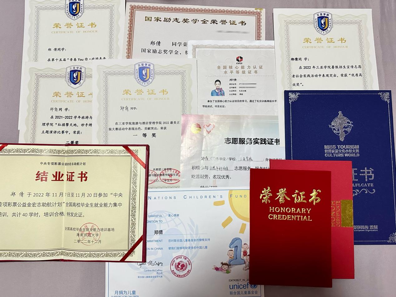 郑倩,出生在孔孟之乡、儒家文化发源地山东,是一名受齐鲁文化熏陶影响而成长起来的山东女孩,闲暇之余热爱舞蹈、瑜伽和主持。在校期间,郑倩同学担任旅酒学院礼仪队副队长和班级学习委员,所学课程平均成绩绩点为3.63,积极参加各级各类社会实践活动,曾获得国家励志奖学金、学业优秀奖学金、校级三好学生、优秀班干部、优秀志愿者、2021世界旅游文化小姐大赛海南赛区季军、第十五届旅游嘉年华最美正装大赛一等奖 、三亚学院旅业管理学院“红旗擎天地,妙手袖乾坤”主题演讲比赛二等奖、第十五届旅游嘉年华线路设计大赛二等奖、三亚学院第三届“金鹭杯”经典诵读大赛三等奖、三亚学院暑期招生宣传“优质高效奖”等荣誉。子曰:“见贤思齐焉,见不贤而内自省也”,郑倩同学始终保持虚心学习,保持人品善良,继续自律努力。