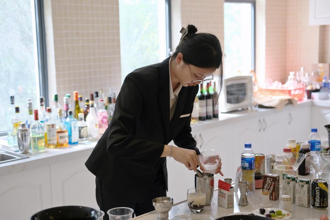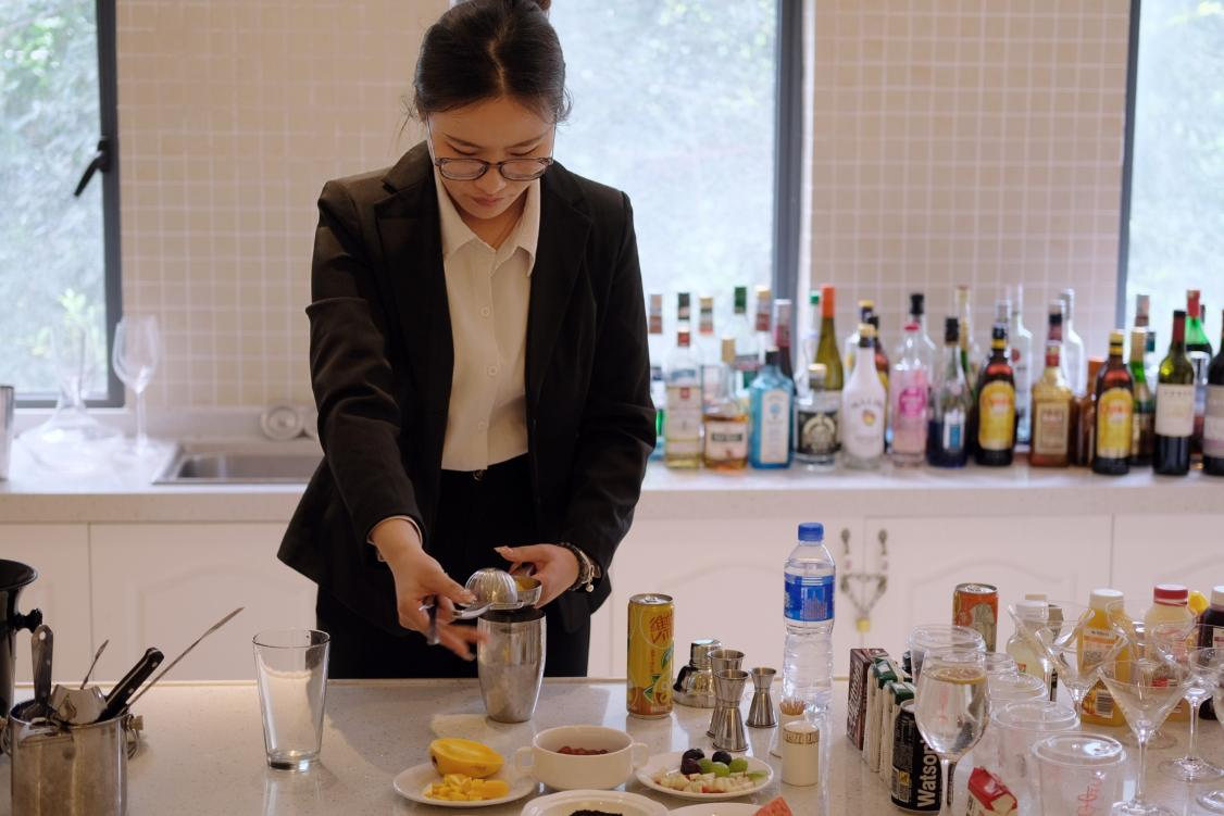 品鉴岁月窖藏,窥见酒中智云,酒水是时间的沉淀与升华,我们熟知有一种酒,利口酒咖啡,它融合冰咖啡与利口酒、鲜奶油,制作出比较成熟的味道,有咖啡的清香也有酒香,在第二分会场的酒水社团为大家带来调酒展示,并请老师品尝,随后由老师做出点评。