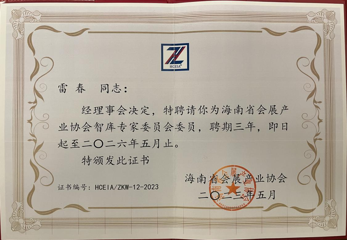 近日,海南省会展产业协会智库专家委员会授证仪式活动在三亚市举办。经海南省会展产业协会理事会决定,特聘请我院会展经济与管理专业主任兼三亚市会展产业协会副会长雷春副教授为海南省会展产业协会智库专家委员会委员。