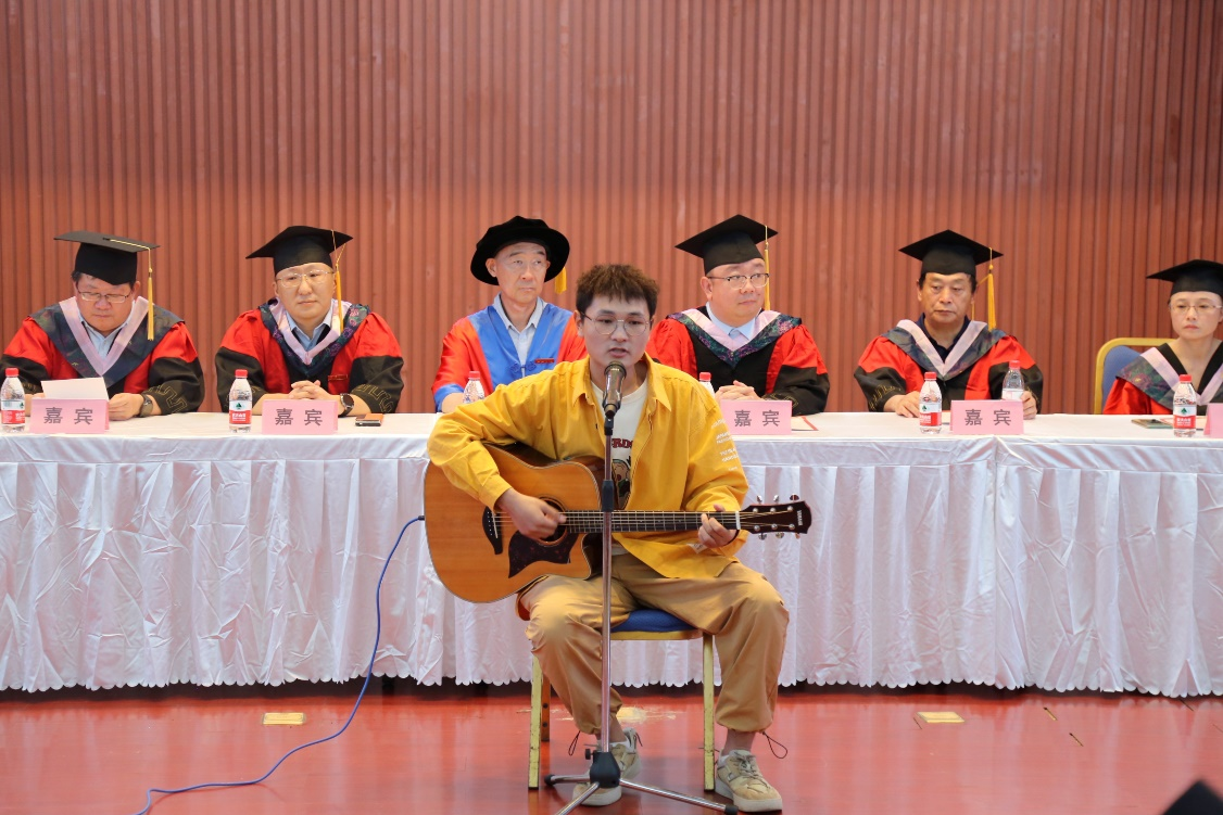 学士学位授予仪式在大一学生施天弋的吉他弹唱《晴天》表演中圆满推进中,犹如华美的乐章,我院毕业学子们在未来的日子里不怕困难,从容不迫,勇往直前。