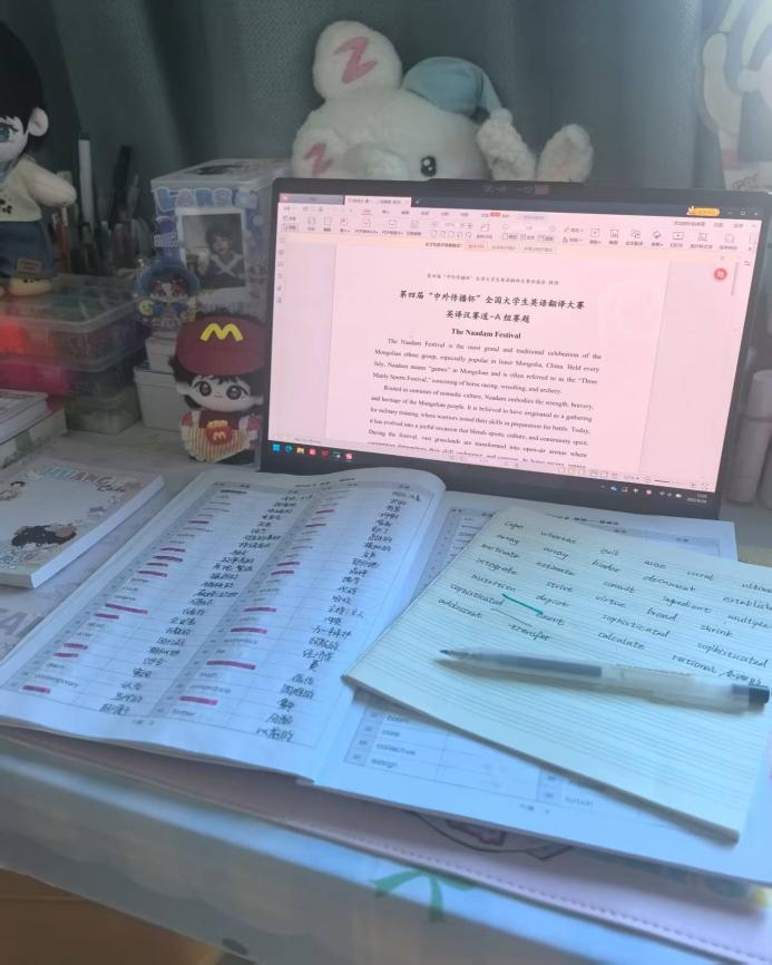 会展2401班徐苑涵同学自暑期启动备赛以来,便将 “精准传递文化内涵” 作为目标。每日固定投入 3 小时积累双语素材,从春节、端午等传统节日的习俗流程,到傣族泼水节、蒙古族那达慕的特色细节,她逐字打磨词汇与句式,在 “英译汉”“汉译英” 的反复推敲中,感受不同文化思维的碰撞。“比赛过程中,时间与质量的平衡考验着我的应变力,也让我意识到自身知识储备的不足。