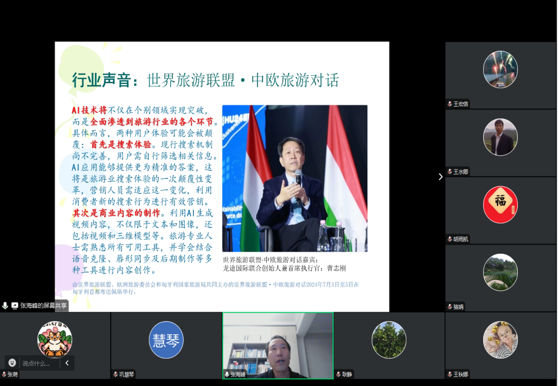 8 月 12 日晚,旅酒学院岛屿生态与旅游开发团队组织开展暑期学术沙龙活动,特邀专家张海峰教授主讲 “AI 时代旅游产业发展及旅游高等教育面临的机遇与挑战”。耿静教授、王秋娜副教授、骆娟副教授等团队成员共同参与,围绕 AI 赋能旅游业的核心议题展开深入探讨,为团队后续学术研究与实践探索提供方向指引。