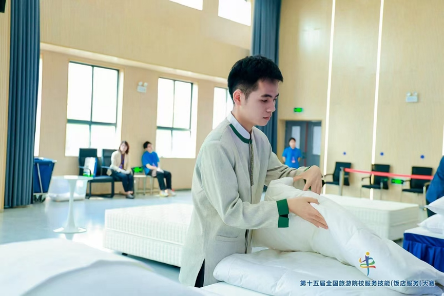 蔡兴松同学在第十五届全国院校服务技能(饭店服务)大赛中荣获本科院校客房服务赛项一等奖