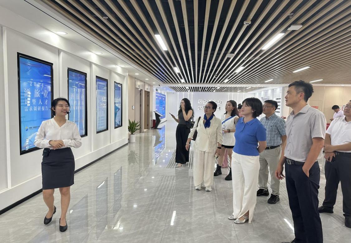 研讨会伊始,李慧院长一行首先对人才市场产业园展开实地考察。产业园工作人员详细介绍了当前园区建设规划、服务功能布局及运营成效,并通过实时更新的人才市场数据,直观呈现三亚人才供需现状 —— 数据显示,文旅行业对兼具专业素养与实操能力的复合型人才需求持续攀升,尤其是酒店运营、会展策划、数字营销等领域人才缺口显著,为后续校企合作方向提供了数据支撑。