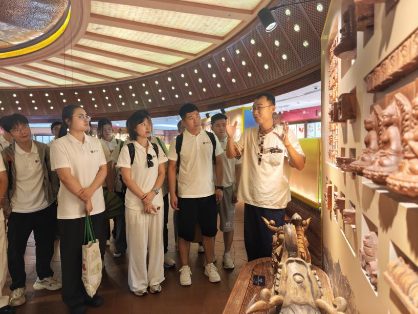 馆内导游全程细致讲解,为同学们揭开非遗背后的文化密码。从尼泊尔的手工艺品,到椰雕工艺的工具演变;从藤编图案里的吉祥寓意,到木雕作品承载的民俗故事,每一段讲解都让抽象的文化知识变得具体可感。