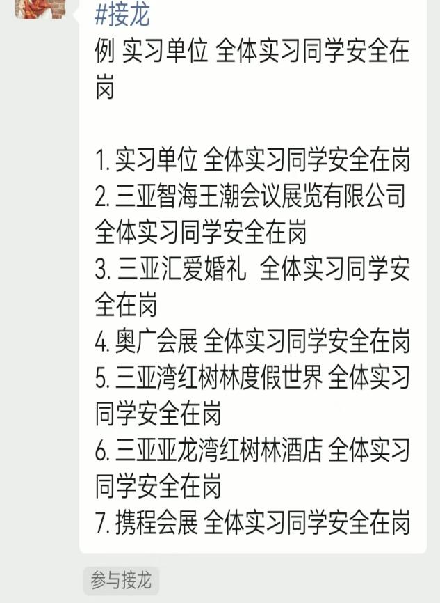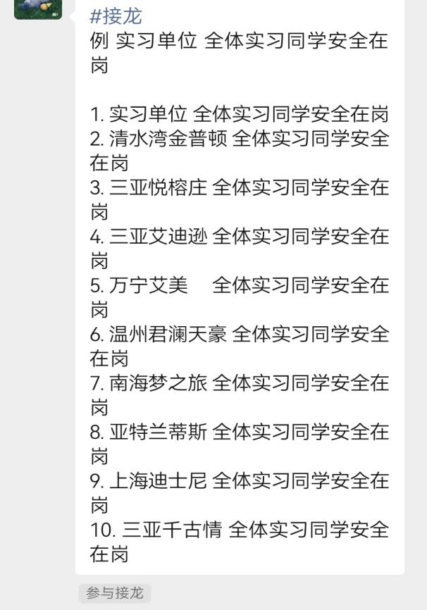 针对正在校外实习的学生群体,学院创新采用线上接龙形式,动态掌握实习学生的在岗与安全情况。各实习单位学生负责人积极发起“实习单位 全体实习同学安全在岗”接龙,覆盖三亚智海王潮会议展览有限公司、三亚艾迪逊、亚特兰蒂斯、上海迪士尼、万宁艾美等多家校企合作单位。这一方式既高效完成了安全排查,也增强了学生的自我管理与互助意识,实现了实习安全管理的实时化、可视化。