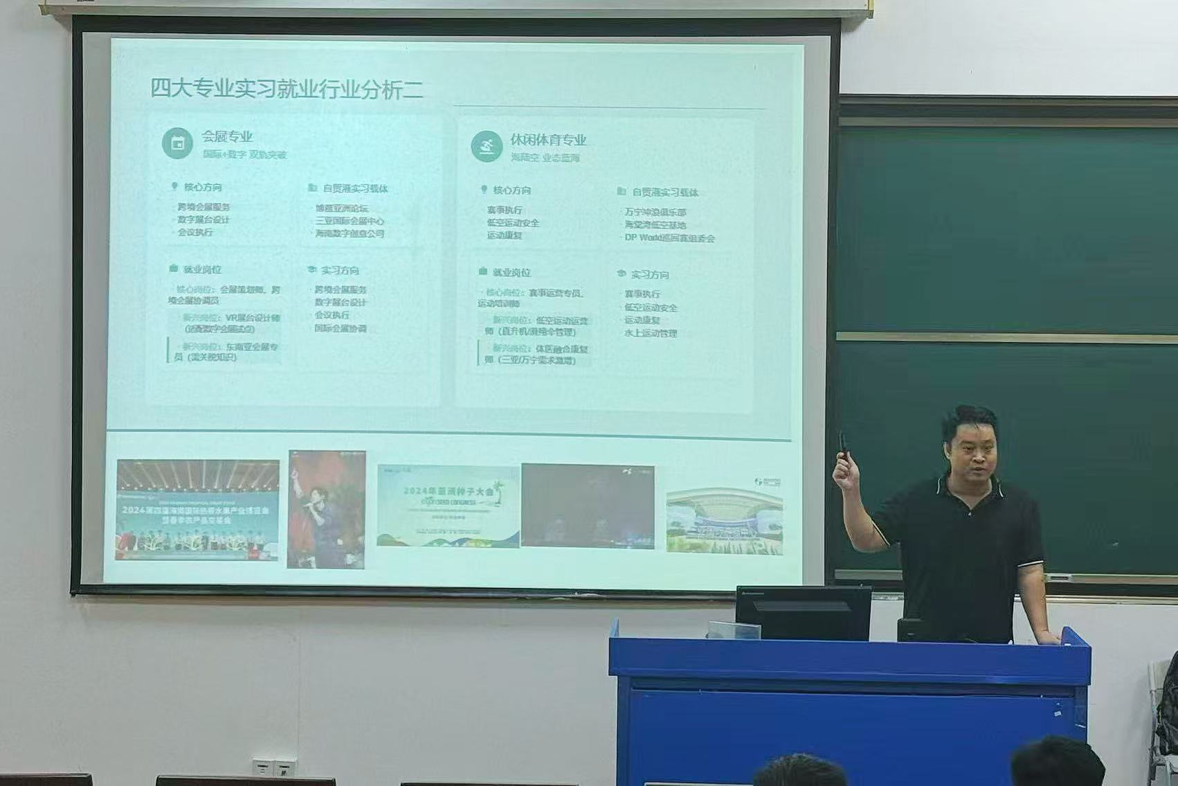 针对旅游管理、酒店管理、会展、休闲体育四大专业,宋君导师逐一拆解实习就业路径。旅游管理专业可锚定文旅 IP 运营、研学产品设计方向,在三亚千古情等载体实习;酒店管理专业聚焦智慧酒店运维、零关税采购,万豪三亚度假酒店等是实践沃土;会展专业深耕跨境会展、数字展台,博鳌亚洲论坛实习机会触手可及;休闲体育专业发力赛事执行、低空运动,万宁冲浪俱乐部等平台助力成长。同时,跨境贸易、数字经济、医疗健康等自贸港新兴行业的展示,也为学生打开了职业选择的多元视野。
