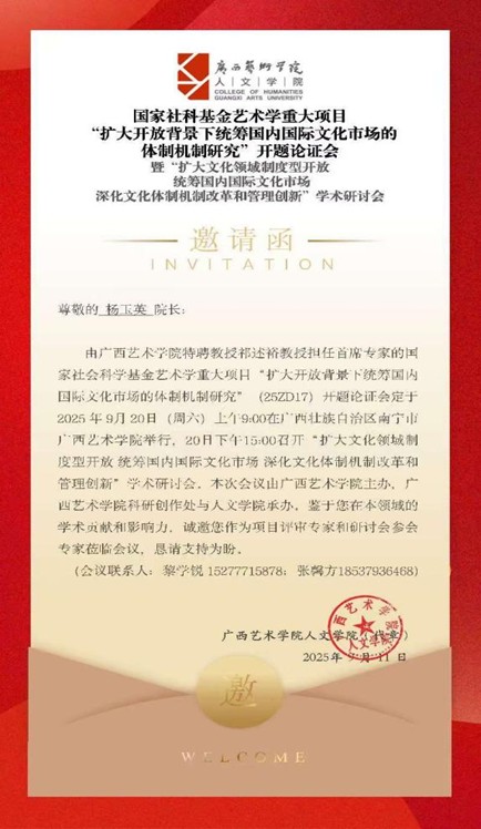 2025年度国家社科基金艺术学重大项目“扩大开放背景下统筹国内国际文化市场的体制机制研究”(25ZD17)开题论证会暨“扩大文化领域制度型开放统筹国内国际文化市场,深化文化体制机制改革和管理创新”学术研讨会于2025年9月20日在广西艺术学院举行。